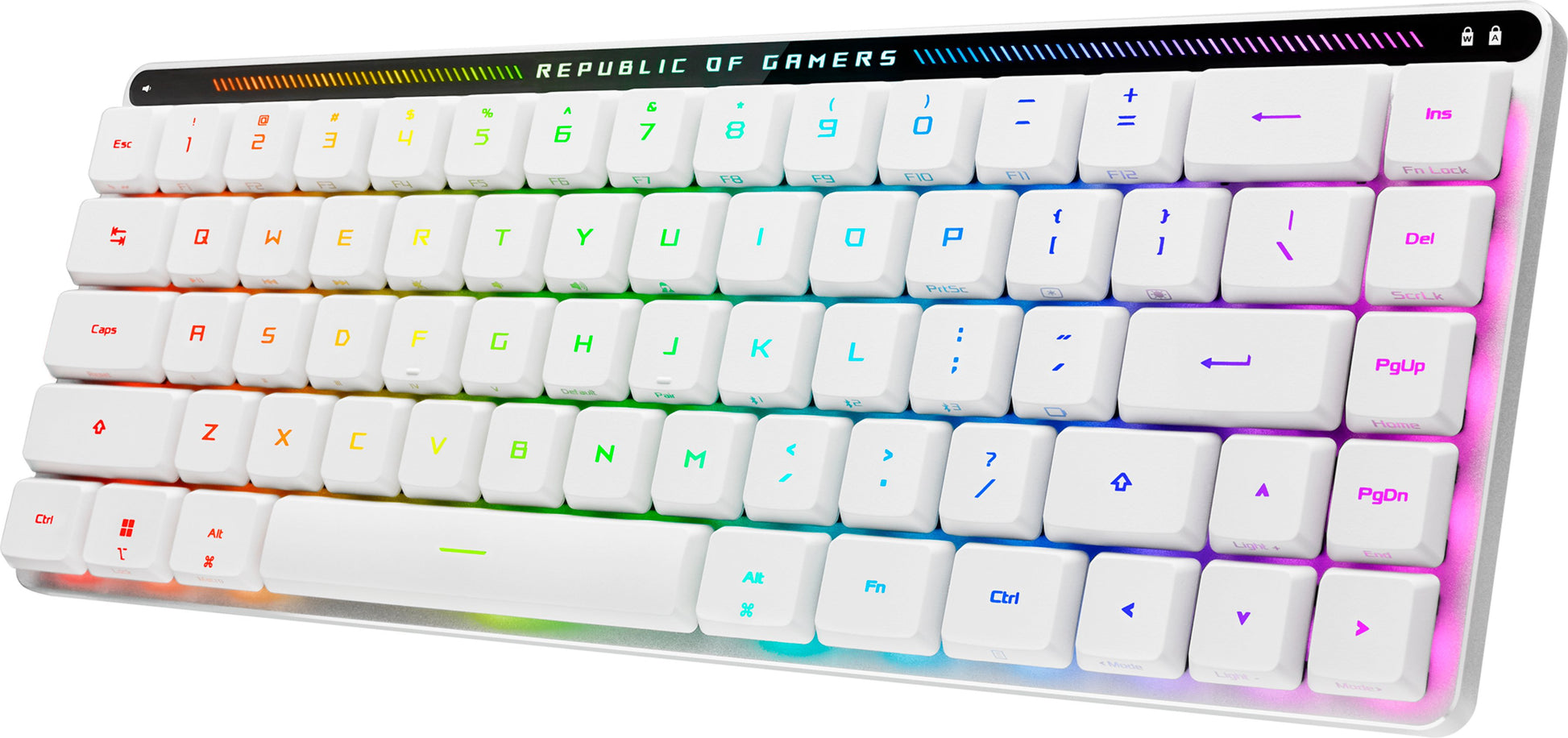Dankzij de 2,4GHz draadloze verbinding met ultralage latency of Bluetooth-modus heb je volledige vrijheid, terwijl de batterij tot 450 uur meegaat. Het toetsenbord is voorzien van individuele RGB-verlichting (Aura Sync) en een unieke touch-bar aan de zijkant voor volumeregeling of macro’s.